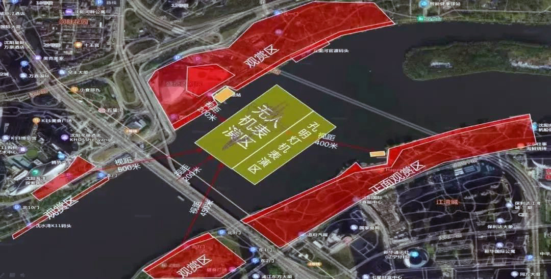 無(wú)人機(jī)表演位置位于盛京大劇院南側(cè)河面上空,渾河兩岸均可觀賞。根據(jù)無(wú)人機(jī)空中圖像位置和高度,建議觀賞區(qū)域如下:1. 渾河南岸由渾河大橋以東至南洋碼頭區(qū)間;2. 渾河北岸由渾河大橋以東至秦開像南面的觀景臺(tái)區(qū)間;3. 渾河大橋以西南北兩岸距渾河大橋500米以內(nèi)區(qū)間。