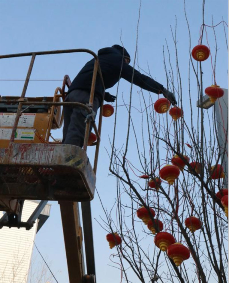 為給園區(qū)營造濃厚的節(jié)日氣氛,給入駐企業(yè)帶來如家般的溫情呵護,沈陽航發(fā)展運營管理有限公司物業(yè)團隊,在零下二十度的氣溫下,凍紅了雙手,冰覆了睫毛,但他們依然堅守,扶梯的扶梯、攀爬的攀爬,將火紅的燈籠掛在園區(qū)主干道、企業(yè)門前。滿街的火紅,是他們對園區(qū)的熱愛,也是對工作的執(zhí)著,更是對崗位責任的滿滿執(zhí)念。園區(qū)的燈亮了,客戶們洋溢的笑臉,映襯著角落里一道道靚麗的風景線,夜幕降臨下,五彩斑斕的彩色燈光給園區(qū)增添了不少喜慶的色彩,也深深的印在了師傅們熱切的心里。