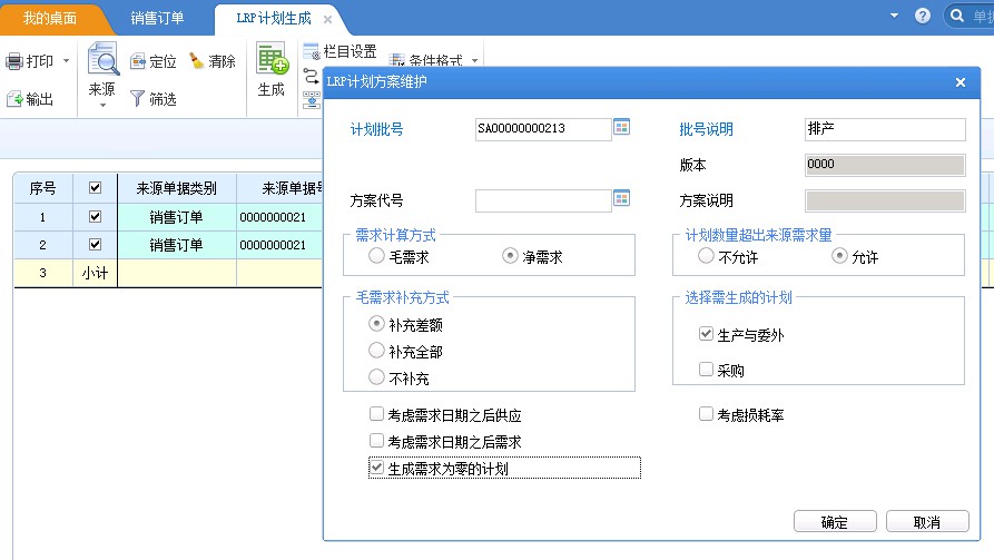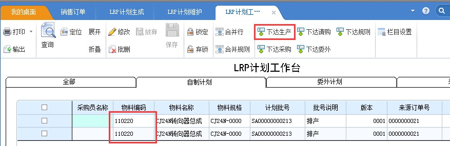 2.在LRP計(jì)劃作業(yè) - LRP計(jì)劃生產(chǎn)中查詢相應(yīng)銷(xiāo)售訂單,生成LRP生產(chǎn)計(jì)劃,在LRP計(jì)劃維護(hù)中聯(lián)查到相應(yīng)單據(jù)或者在LRP計(jì)劃工作臺(tái)查詢到相應(yīng)計(jì)劃,選擇需要下達(dá)生產(chǎn)的成品